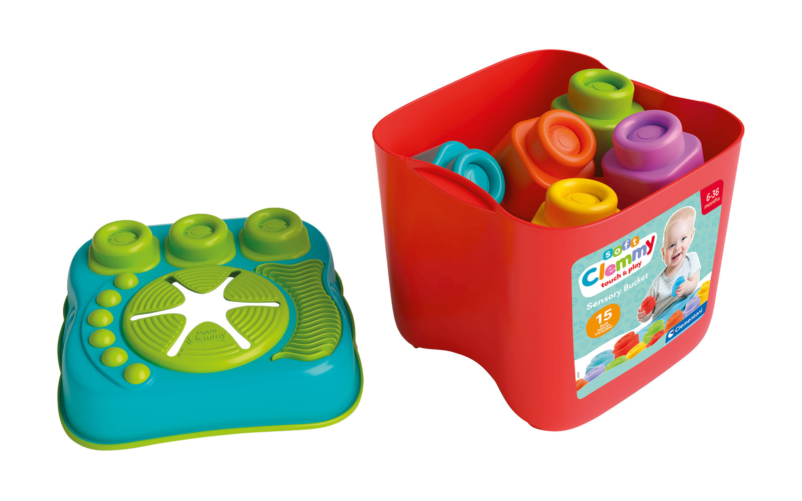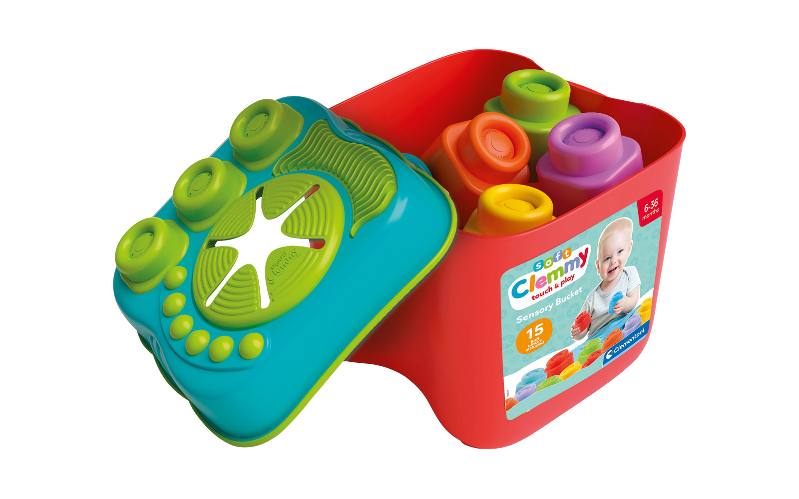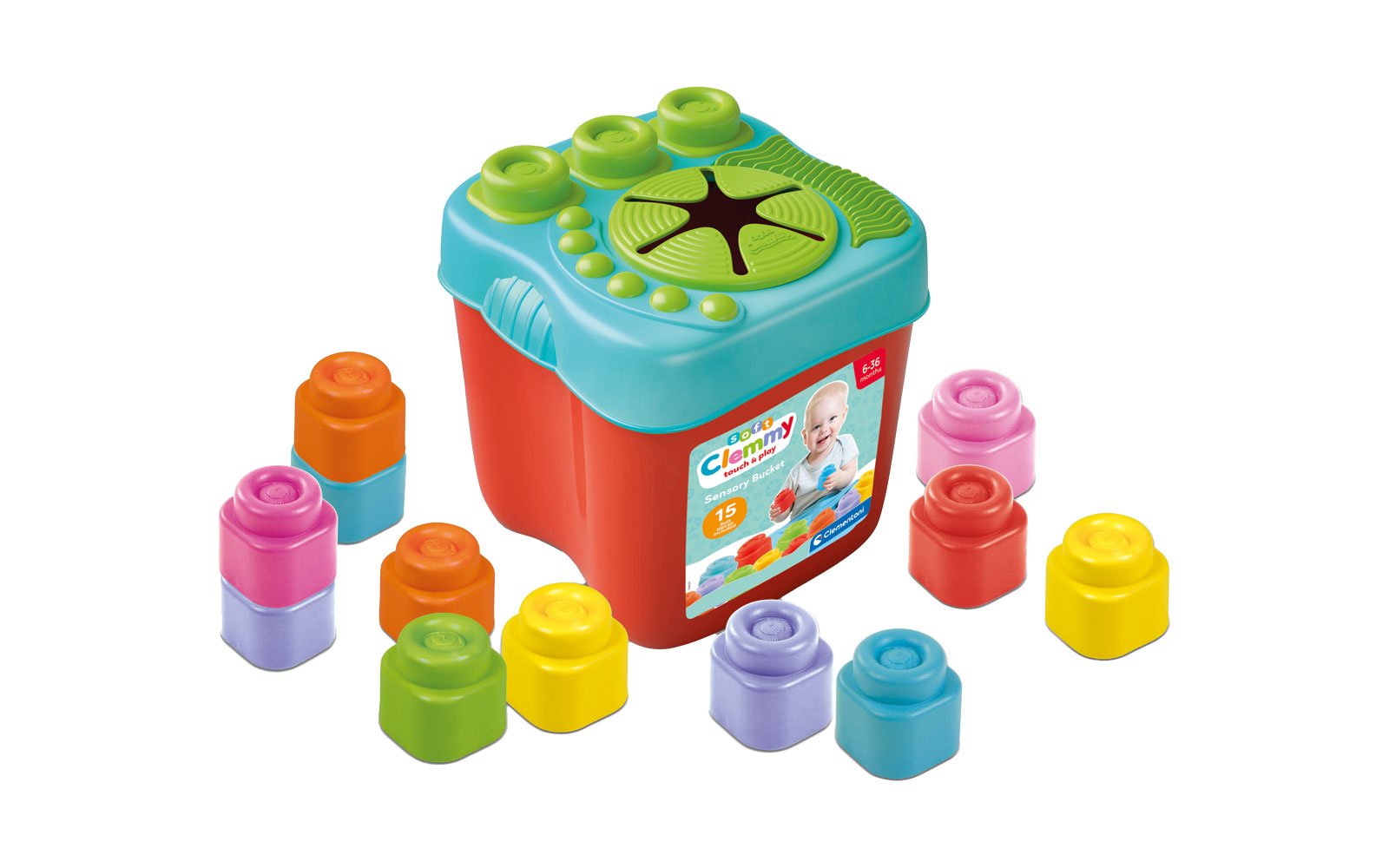Clemmy soft cubes in a crate for your little ones. 15 soft cubes included. The crate contains a hole where children can insert the cubes to strengthen their motor skills. Suitable for children from 6. to 36. one month of age.
